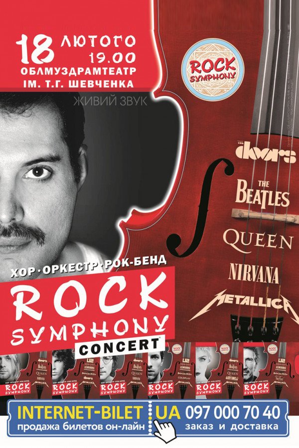 Rock Symphony відбудеться 18 лютого 2016, 19:00, четвер в Обласний академічний український музично-драматичний театр імені Т. Г. Шевченка. За допомогою сервісу internet-bilet.ua, Ви зможете з легкістю забронювати, замовити та купити квитки на концерт, спектакль, оперу, балет, майстер-класи, спортивні та дитячі заходи, що Вас цікавлять, оплативши їх найбільш зручним для Вас способом: через інтернет банківською карткою VISA/MasterCard, готівкою або кур'єром, якщо зробите замовлення квитка з доставкою.