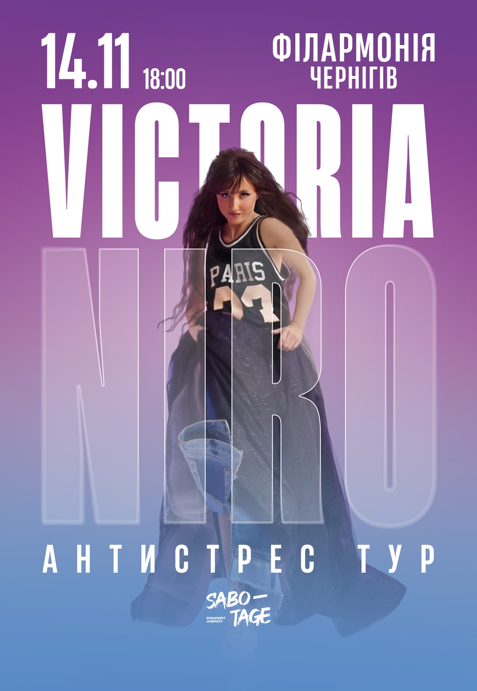 Зустрінемось, щоб заспівати разом щирі й мрійливі хіти: «Питань нема, «Не знаю», «Рожеві окуляри» і ще багато пісень! Victoria NIRO — одна з найчуттєвіших голосів нової української сцени. Вона поєднує хіп-хоп і поп, та створює музику про любов, силу залишатися собою й мріяти.
